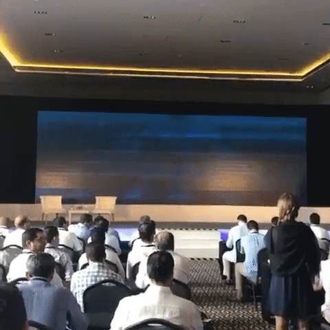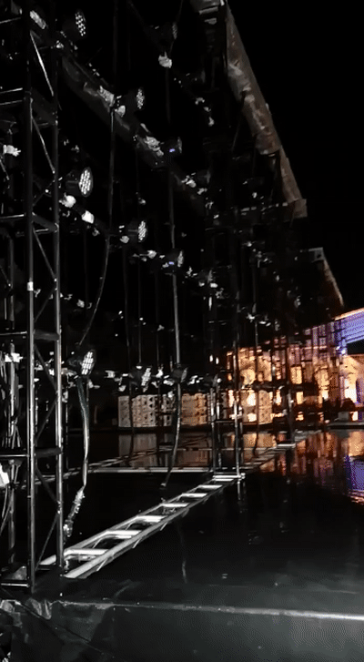 Movimiento de pantallas de LED logrado a base de rieles y carretillas, controlados por computadora para lograr un movimiento tipo Tetris.